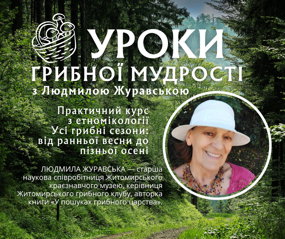 FROM УРОКИ ГРИБНОЇ МУДРОСТІ З ЛЮДМИЛОЮ ЖУРАВСЬКОЮ 25 Бер, 2026 Запрошуємо на практичний курс з етномікології. Усі грибні сезони: від ранньої весни до пізньої осені.